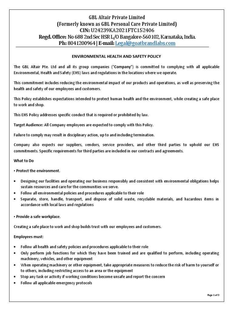 GBL Altair Environmental Health Safety Policy PDF Occupational
