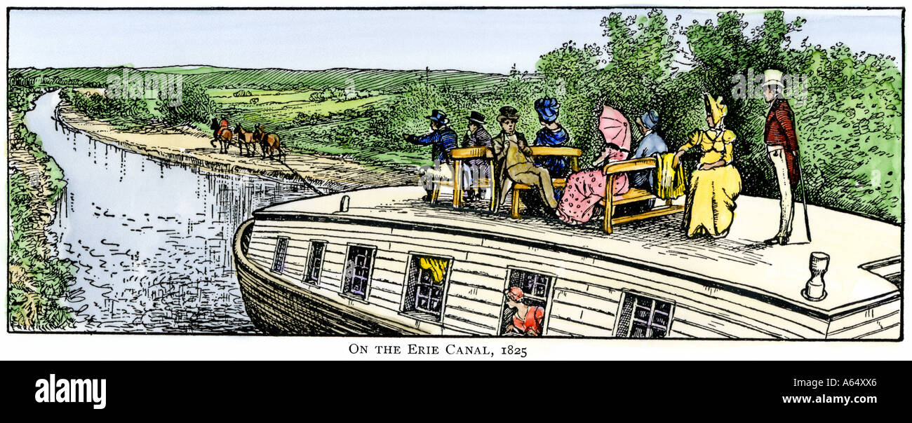 Grain boat towed by a mule team on the Erie Canal 1800s Hand colored