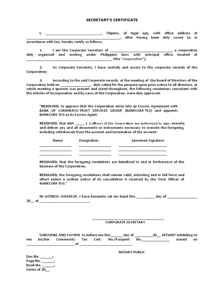 2022 Escrow Secretary #39 s Certificate PDF Document Legal Documents