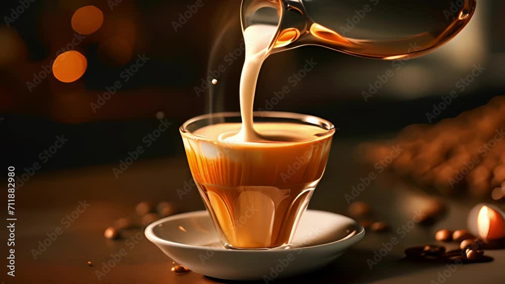 Vidéo Stock Steamed milk is being poured into a glass of steaming