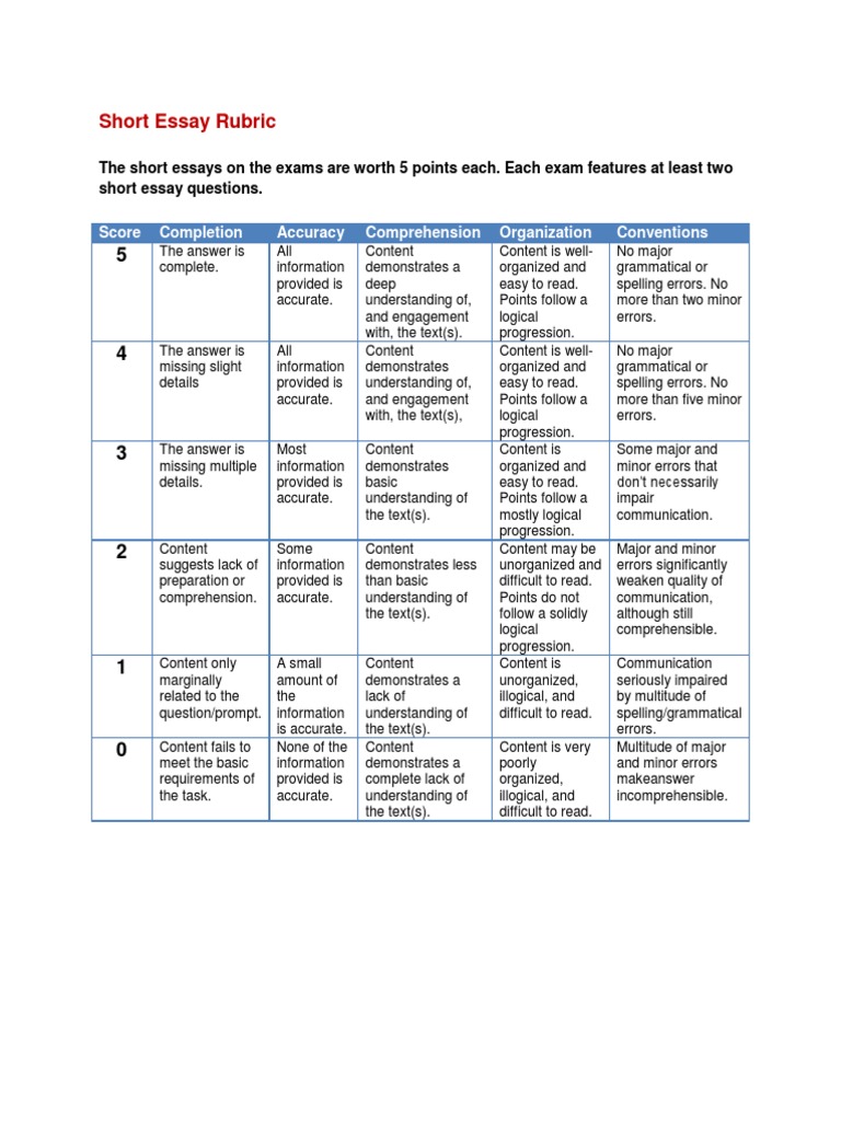 Short Essay Rubric Rubric (Academic) Test (Assessment)