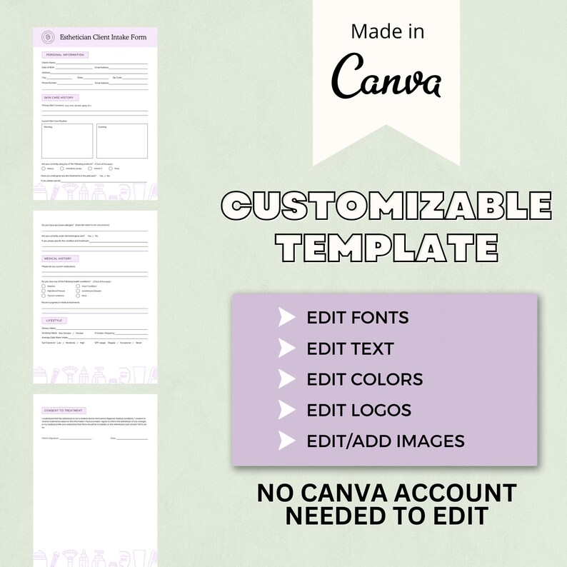 Esthetician Intake Form Template/editable Printable Esthetician Forms