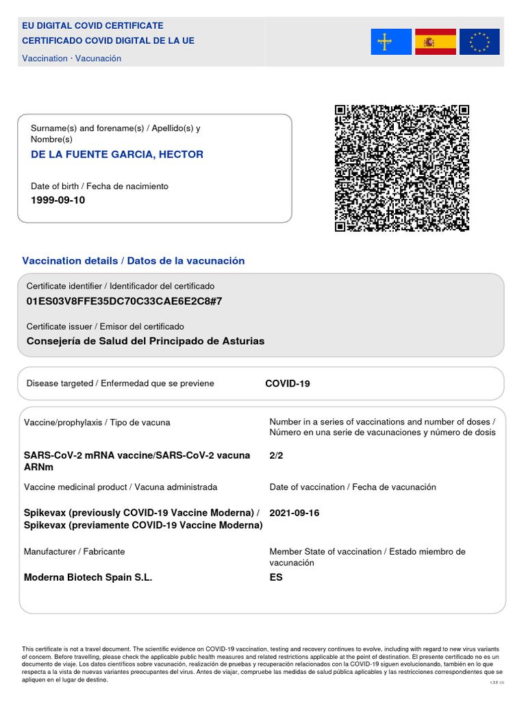 Spanish issued EU Digital Covid Certificate as proof of vaccination to
