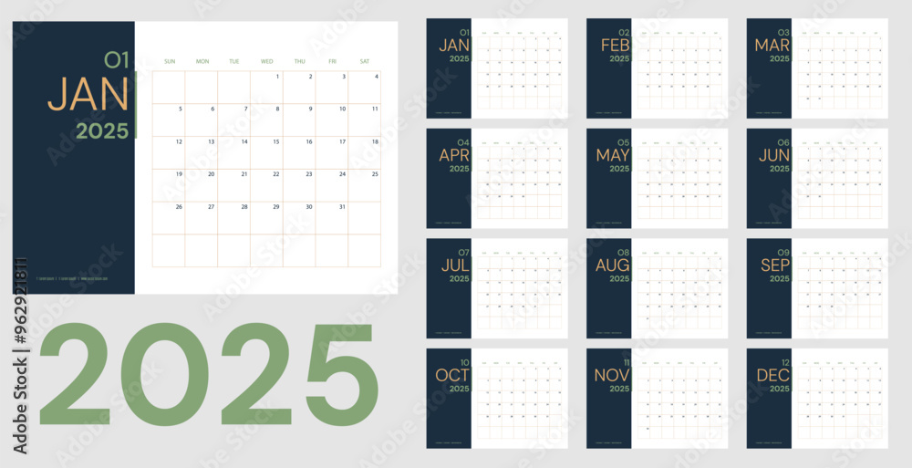 Vector 2025 new year calendar planner template in minimal table number