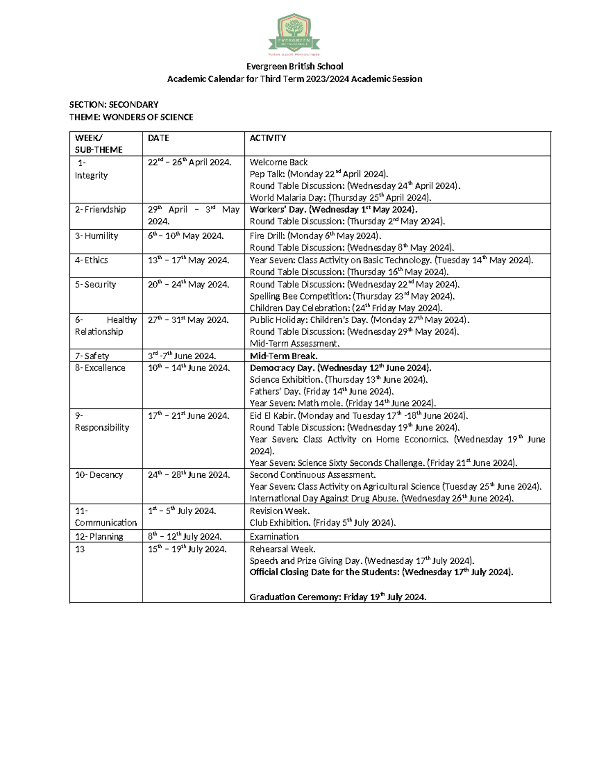 Calendar Secondary Third Term 20232024 1 Evergreen British School