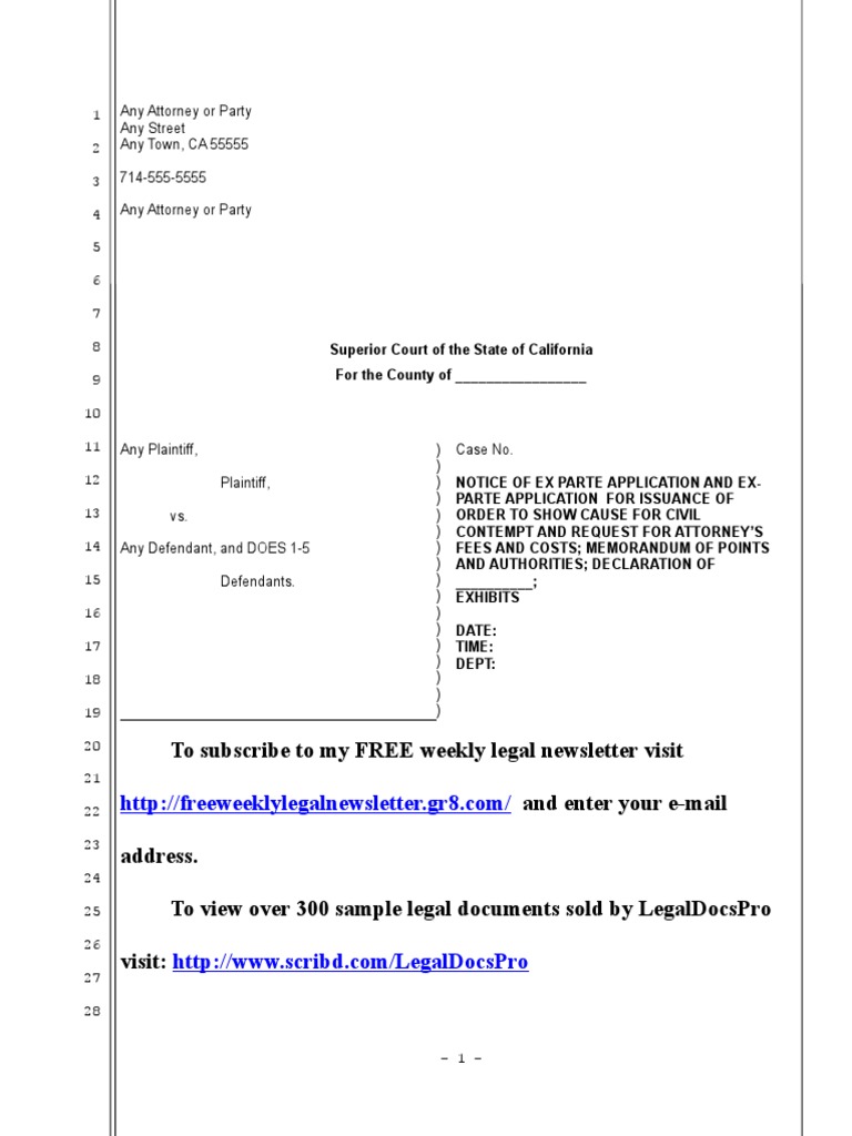 Sample Ex Parte Application For OSC For Civil Contempt in California