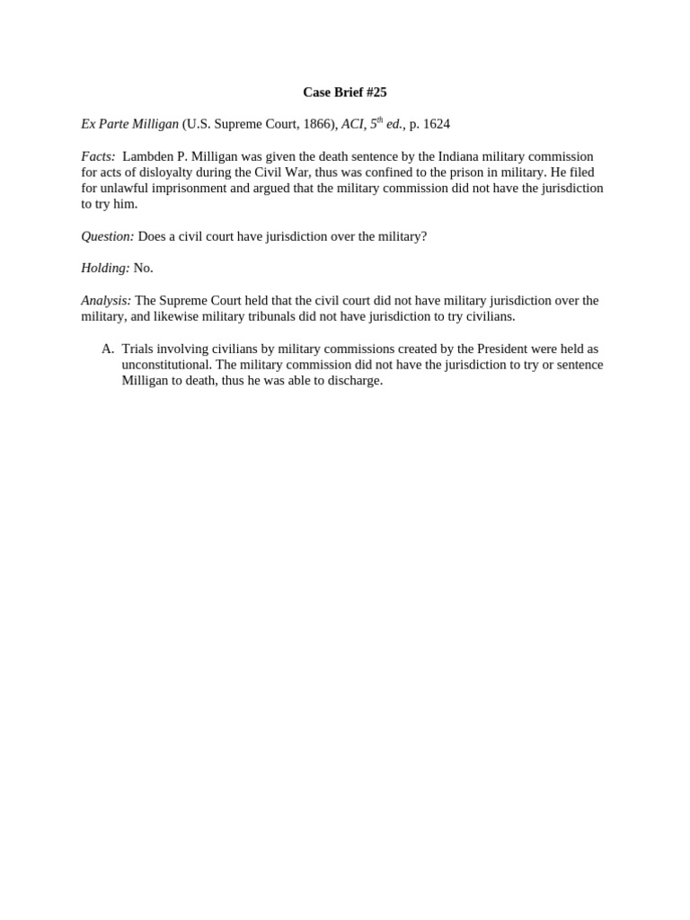 Ex Parte Milligan Case Brief PDF
