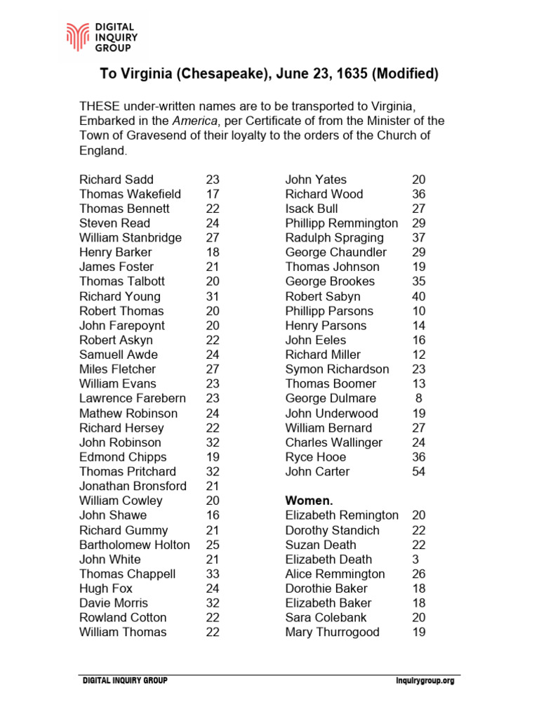 Examining Passenger Lists A1 pdf To Virginia Chesapeake June 23 1635
