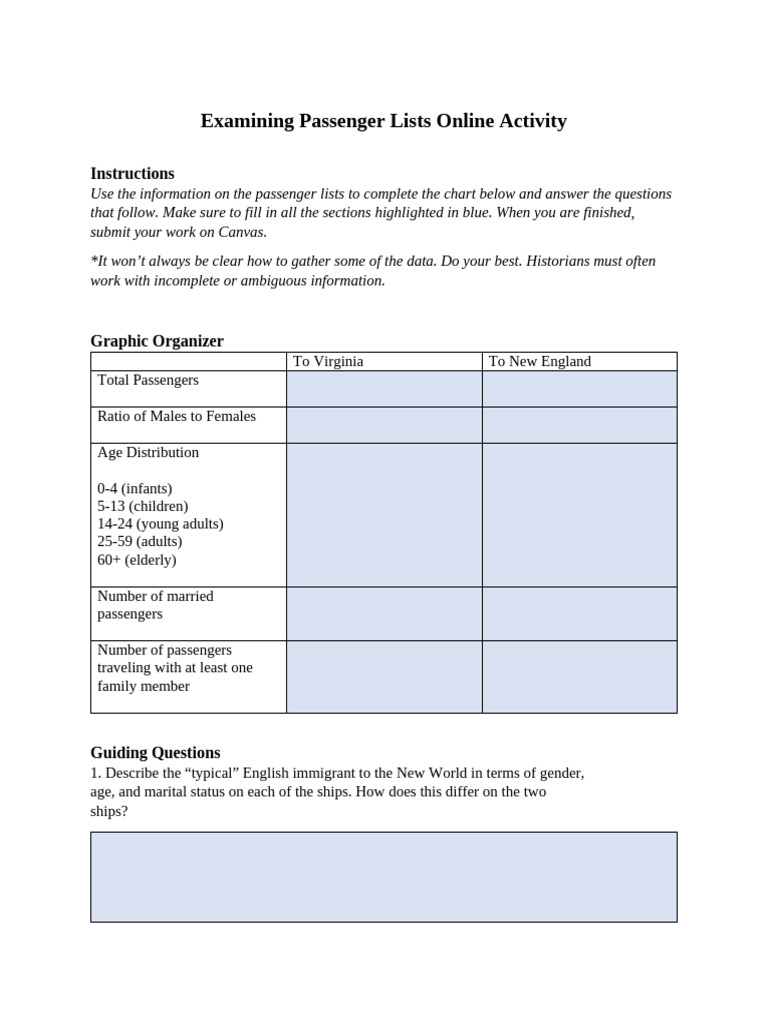 Activity Examining Passenger Lists pdf To Virginia To New England