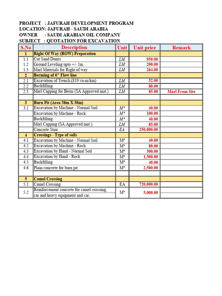 Excavation Bid Template