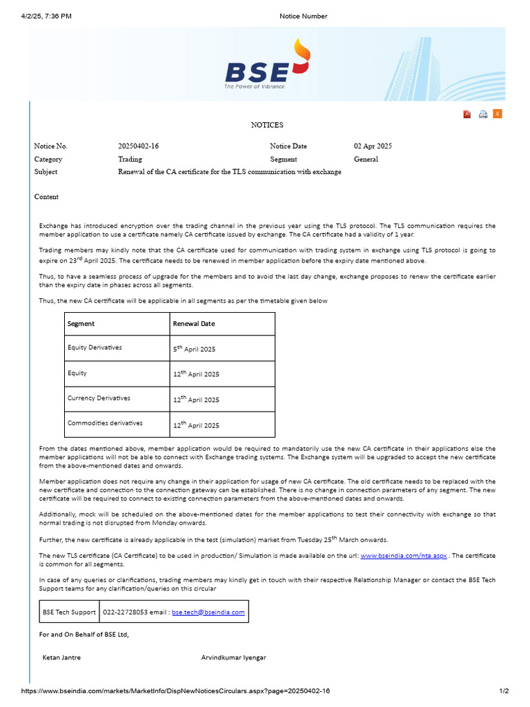 BSE Notified Regarding The Renewal of The CA Certificate For The TLS