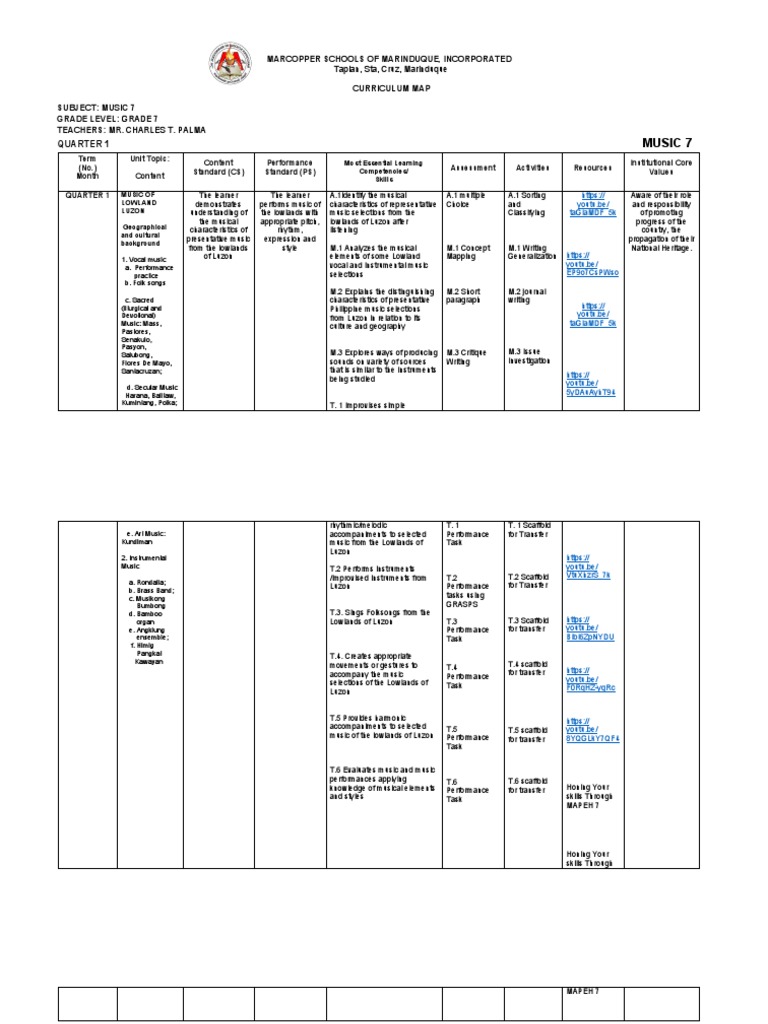 Matatag Curriculum Map Mapeh 7 Exemplar Crossword
