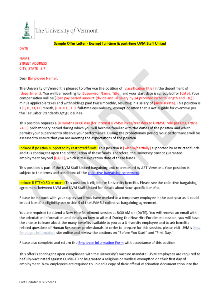Sample: Exempt Position Offer Letter Company Letterhead Doc Template