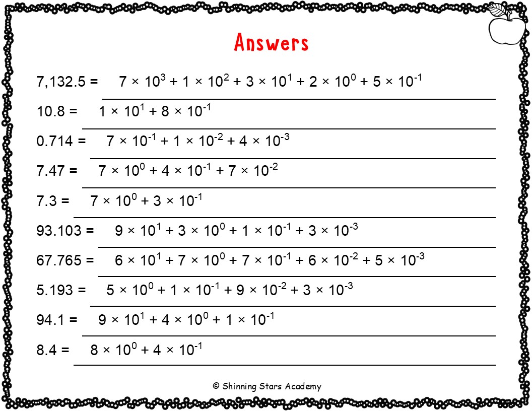Numeric Form to Expanded Notation With Decimals Worksheet With Answers