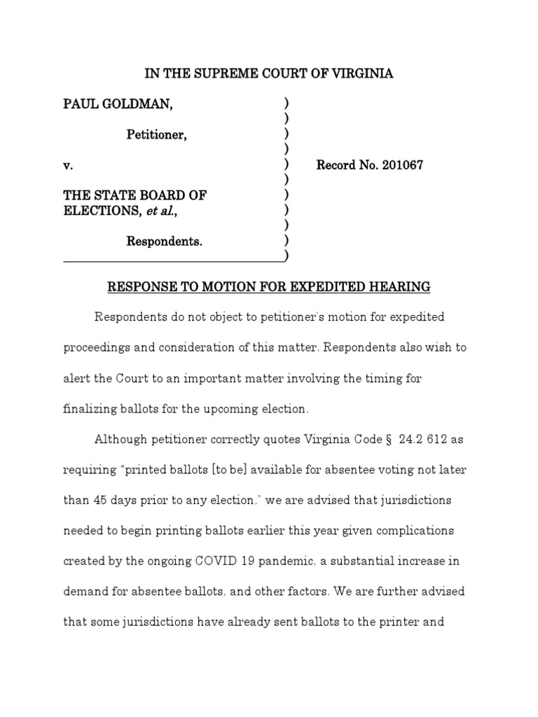 AG Herring Response To Goldman Motion For Expedited Hearing PDF