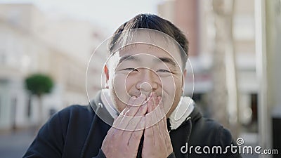 Young Chinese Man Standing with Surprise Expression at Street Stock