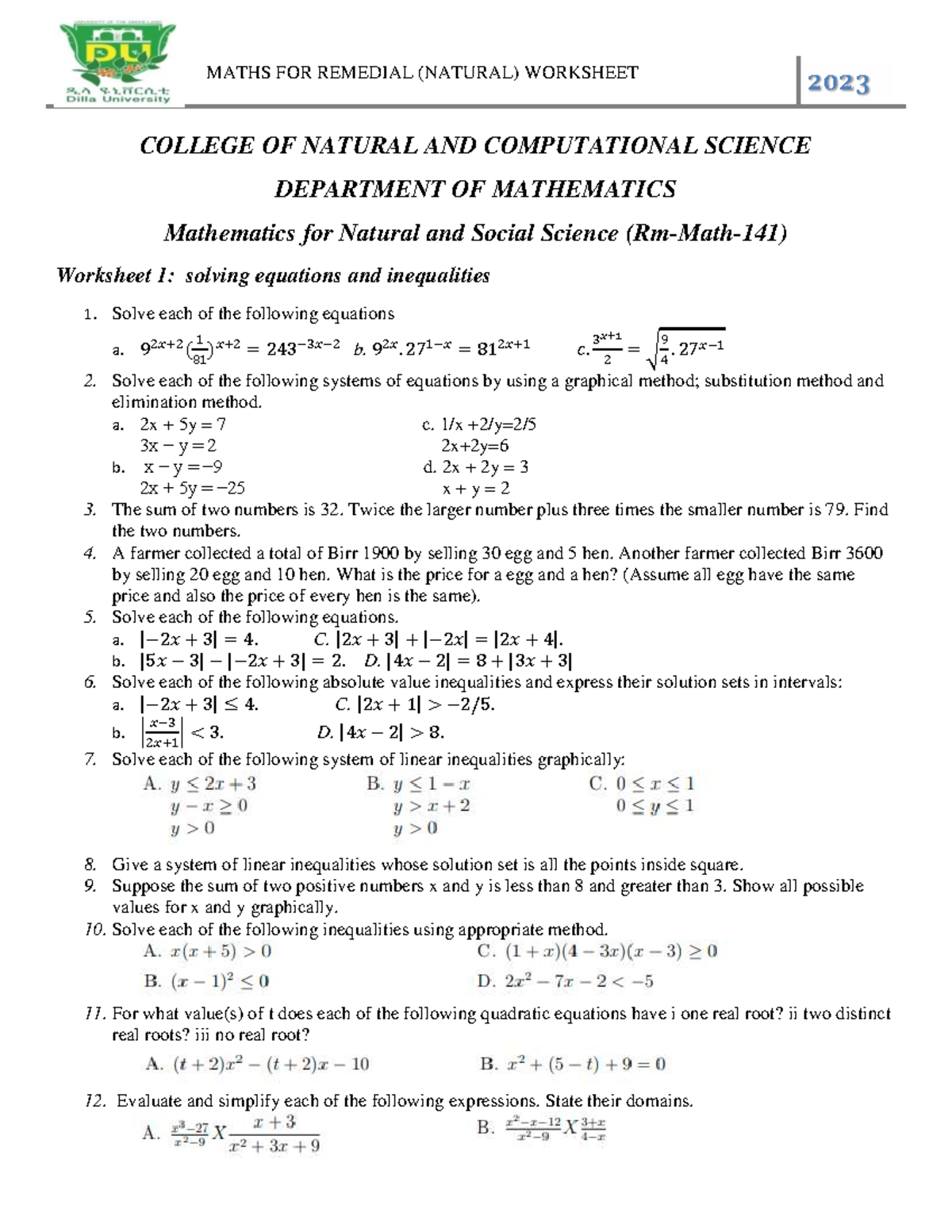 MATHS FOR REMEDIAL (NATURAL) WORKSHEET 2023: Equations Functions