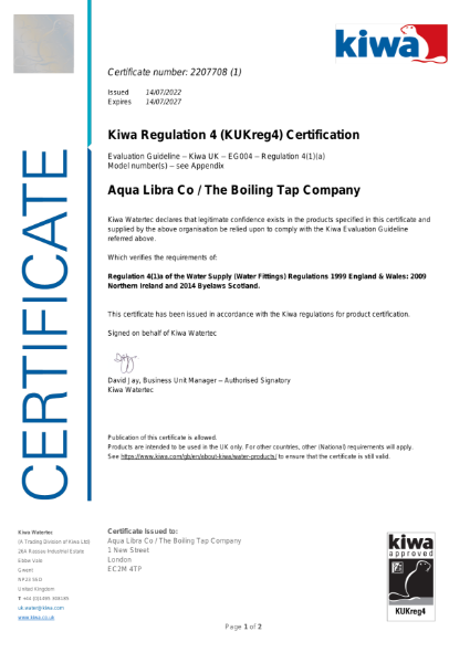 Kiwa Regulation 4 (KUKreg4) Certification taps Aqua Libra Co NBS