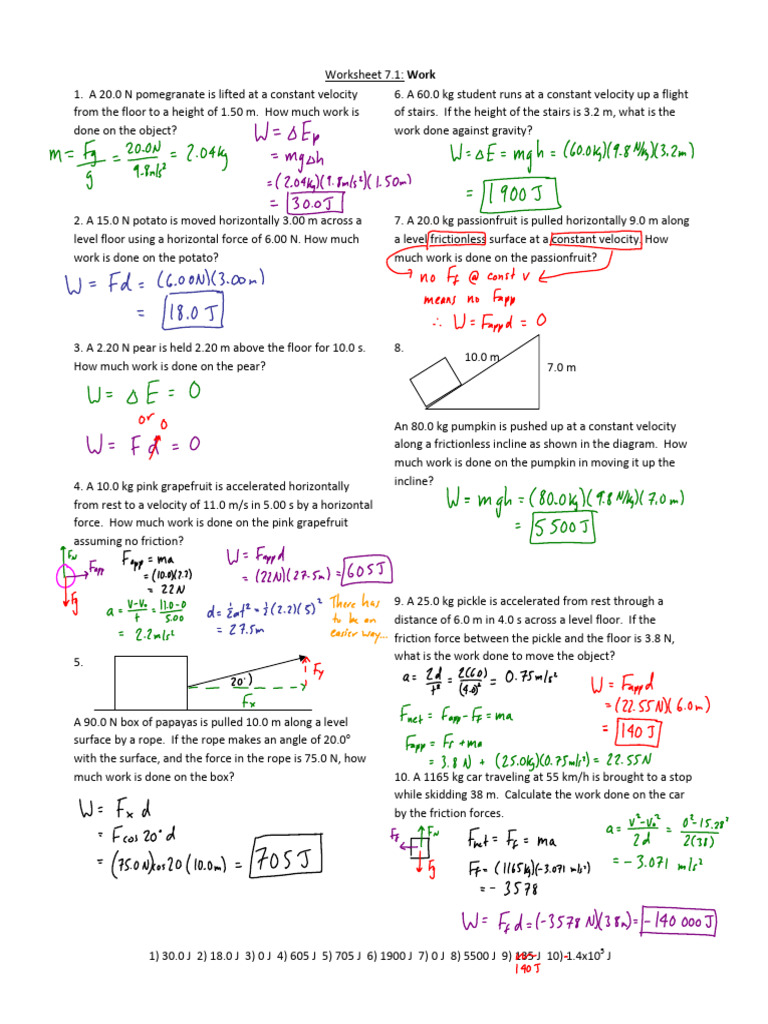 Worksheet 1 Work Key PDF Force Motion (Physics)