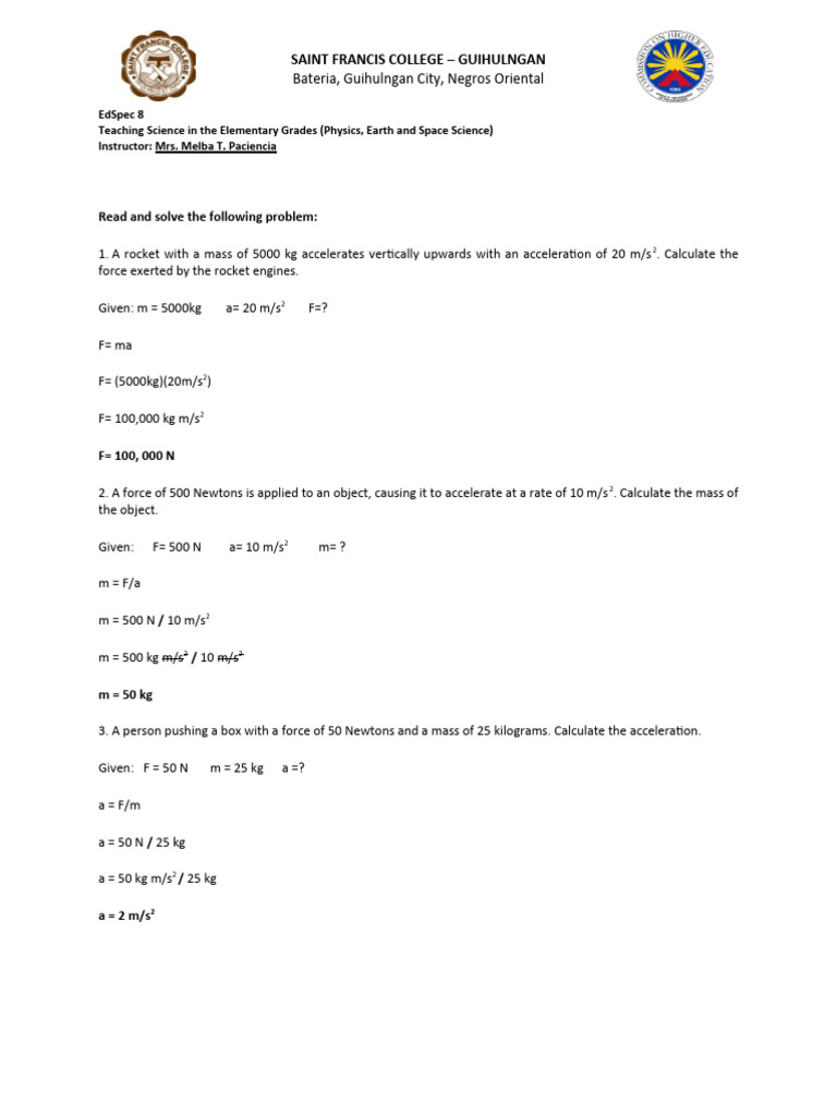 F = ma Worksheet pdf Course Hero