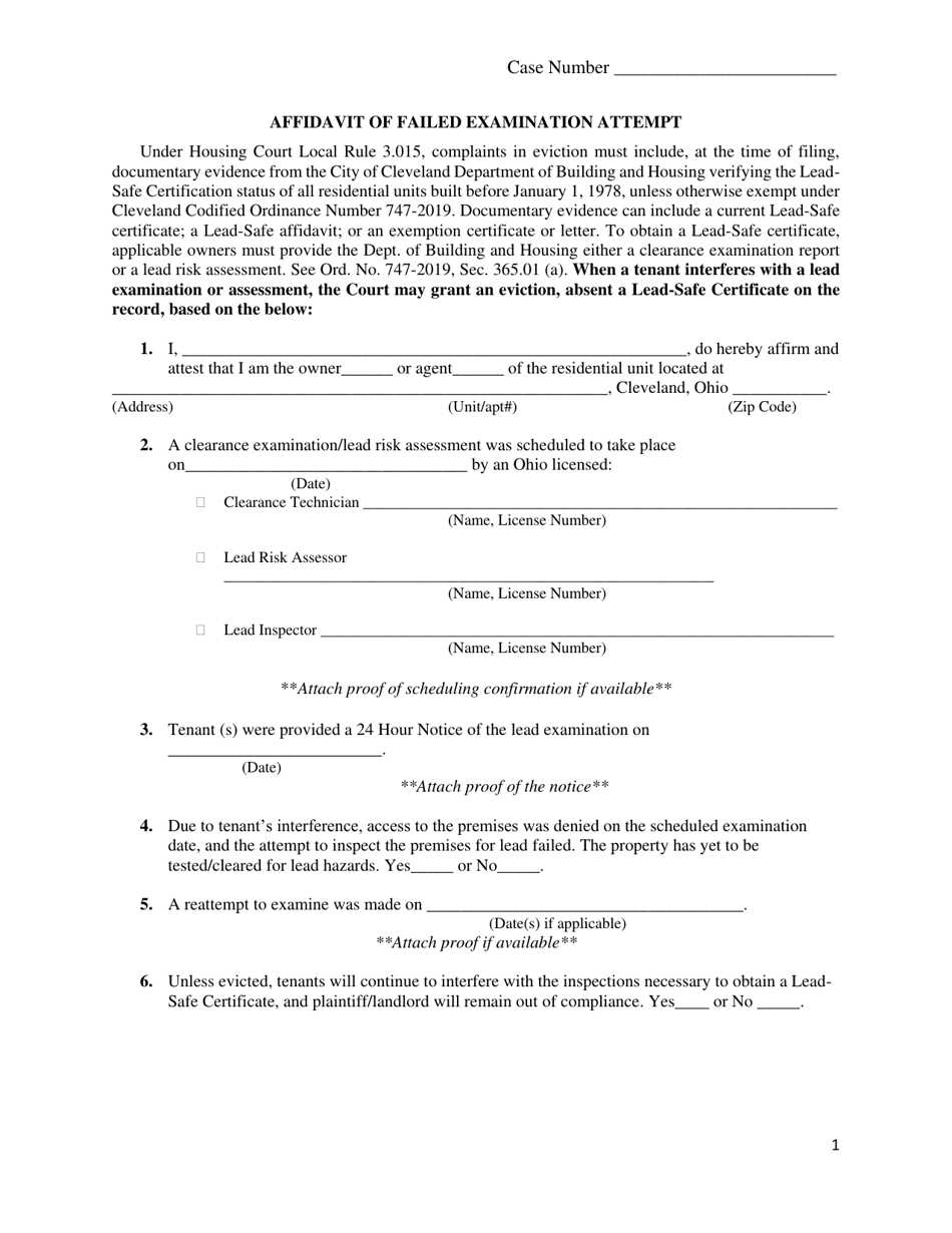 Cuyahoga County Ohio Affidavit of Failed Examination Attempt Fill