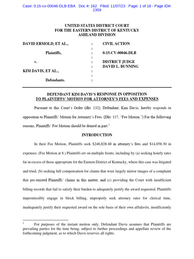 Defendant Kim Davis #39 s Response in Opposition To Plaintiffs #39 Motion For