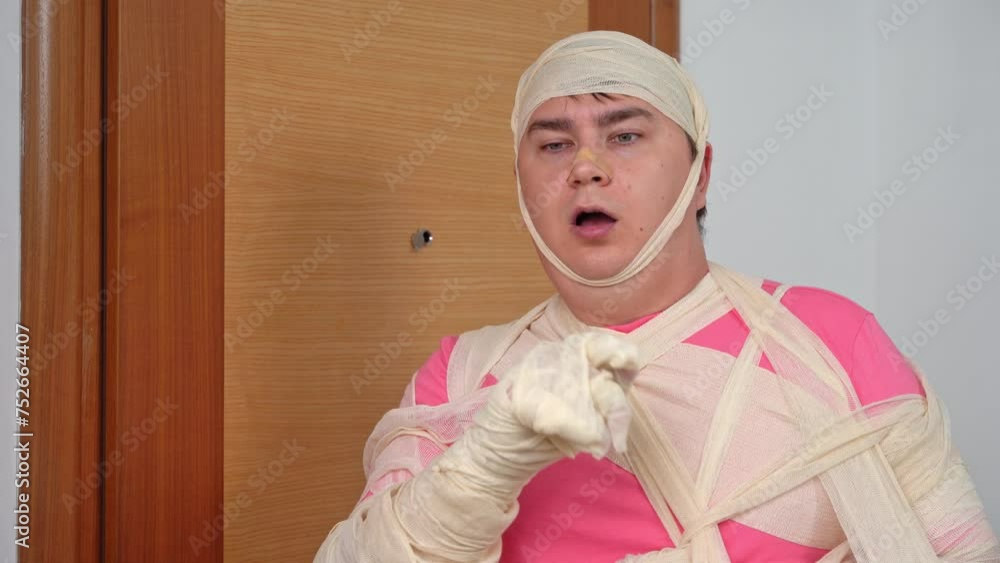 Bad day exhausted man with broken arm concussion covered in bandages