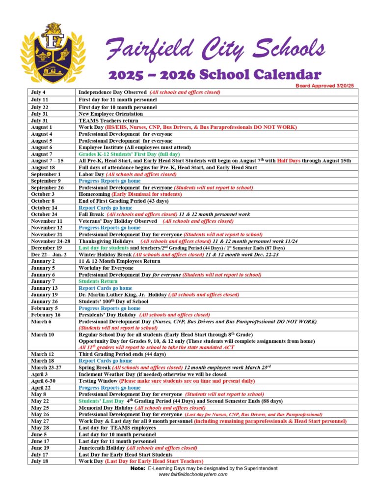 Fairfield City Schools AL Calendar 25 26 Revised PDF EduCounty