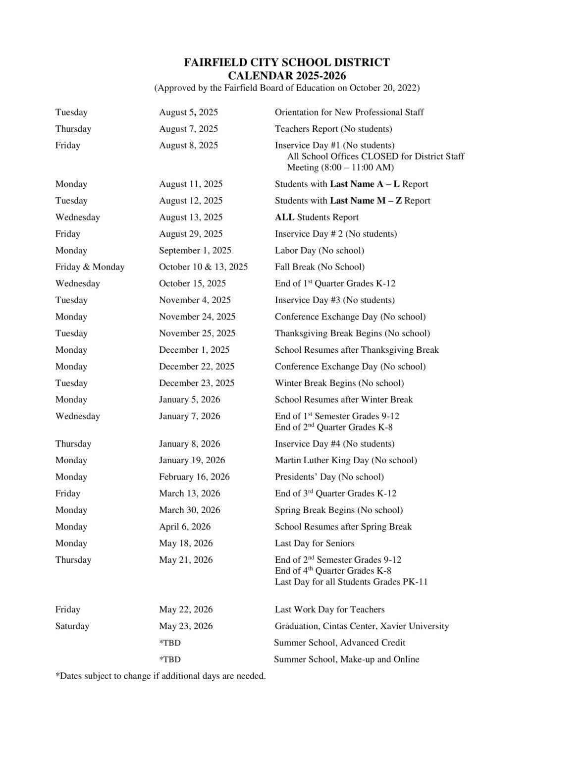 Fairfield Local School District Calendar 25 26 Revised PDF EduCounty