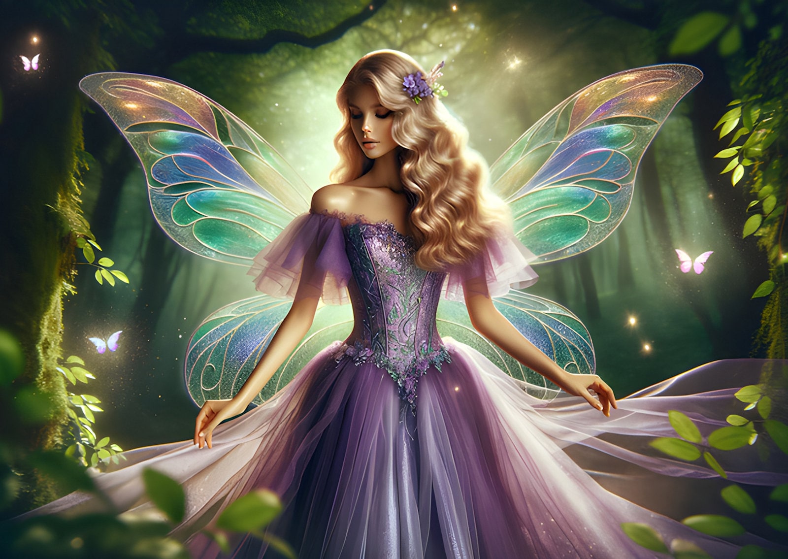 A fairy with a butterfly on its back is flying through a magical field