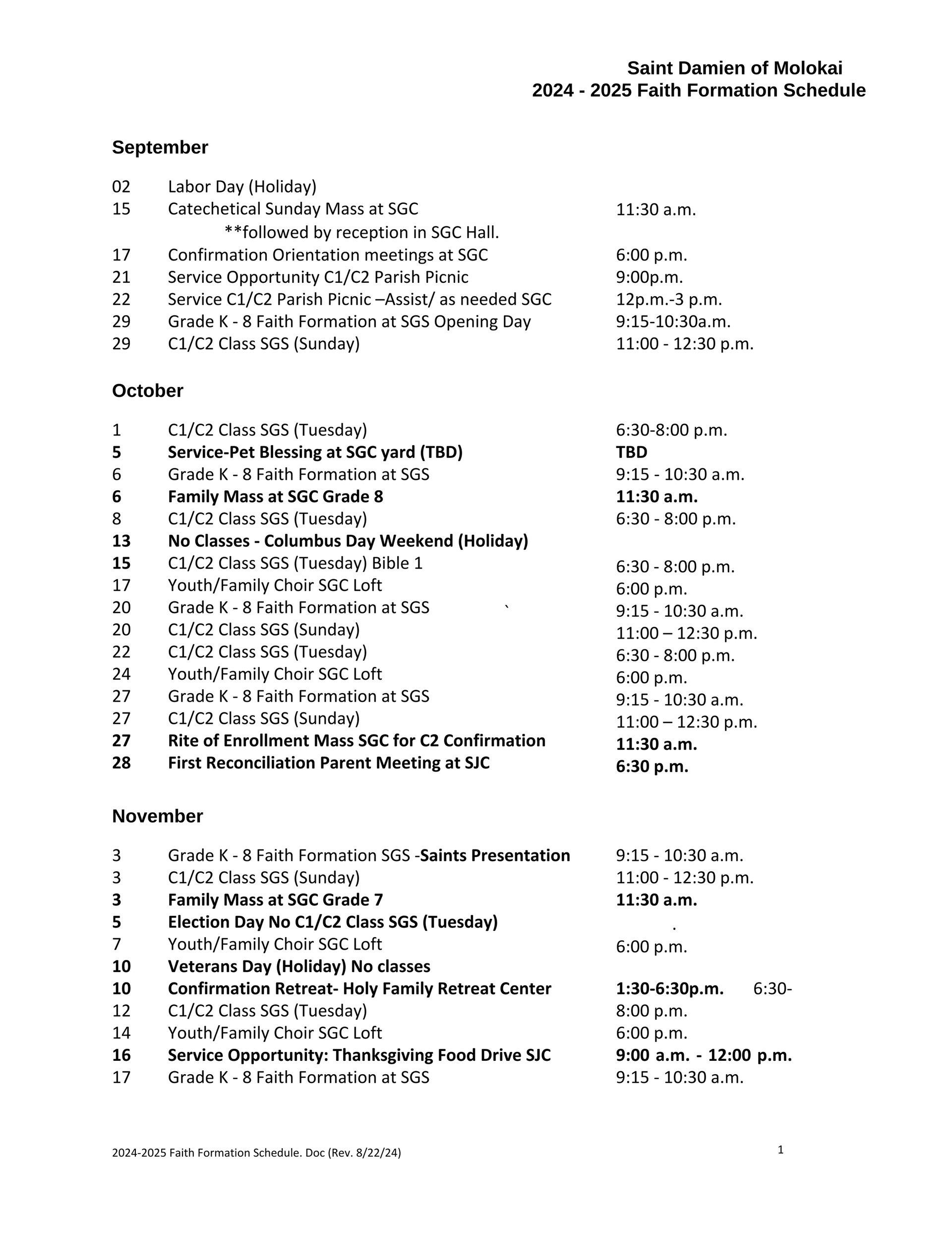 Faith Formation Calendar St Ignatius