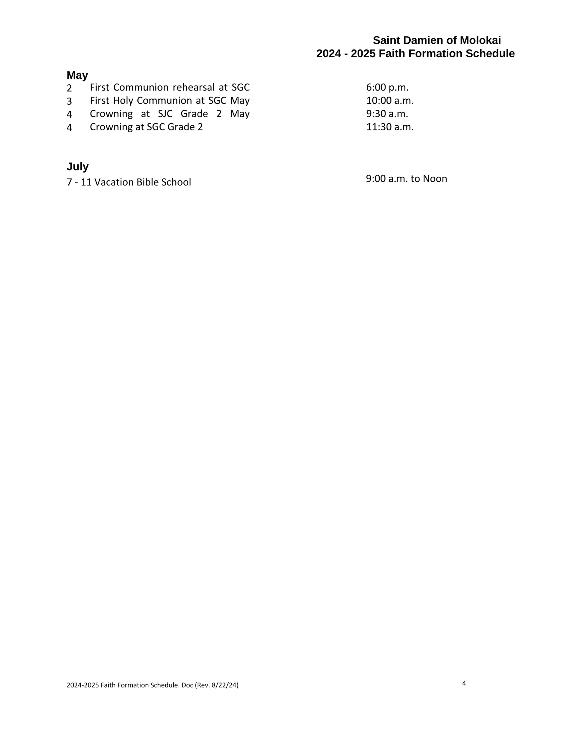 Faith Formation Calendar St Therese Parish