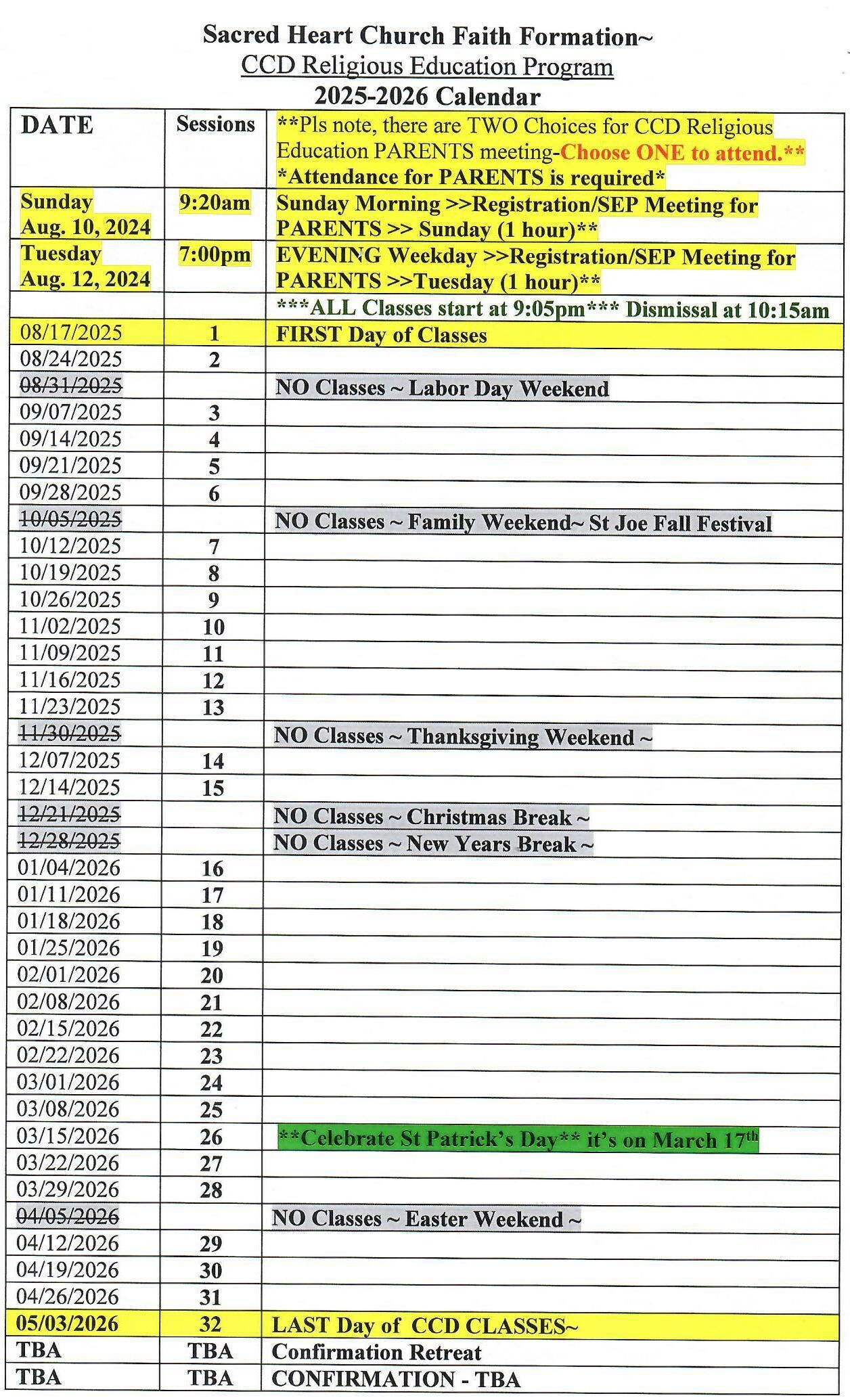 Faith Formation Calendar 2025 2026 St Ephrem Parish