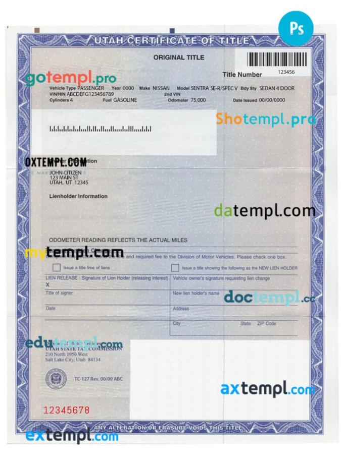 fake Utah certificate of title of a vehicle (car title) download PSD
