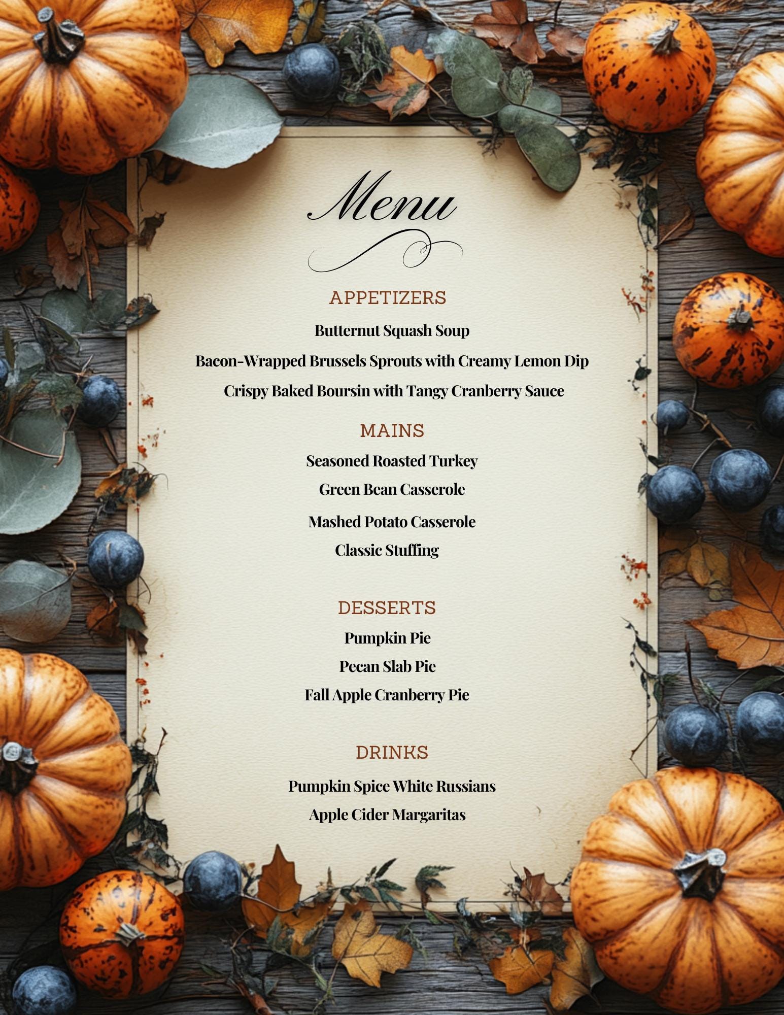 Fall Menu Template for Thanksgiving Dinner Party Wedding Etc With