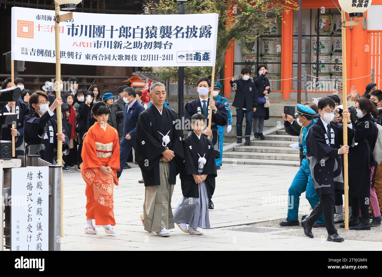 Kabuki actor Ichikawa Danjuro Hakuen (C) and his son Shinnosuke and