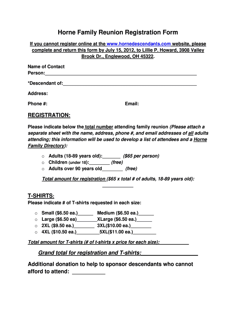 Fillable Online Horne Family Reunion Registration Form Fax Email Print