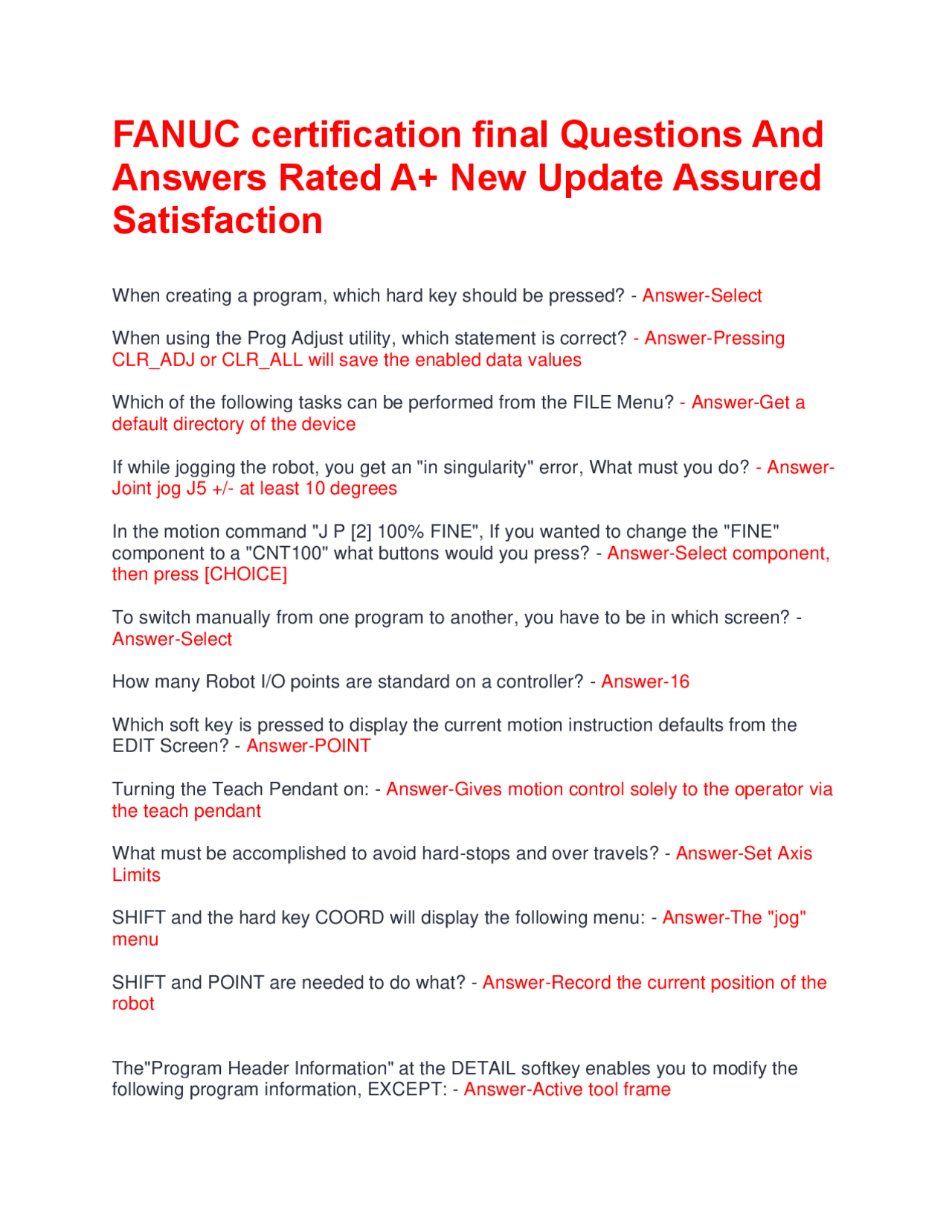 FANUC Robotics Certification Exam Questions and Answers Exams