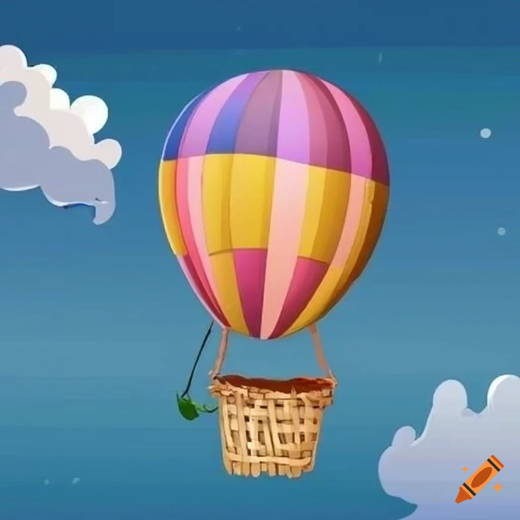 Cartoon image of a hot air balloon flying in the clouds on Craiyon