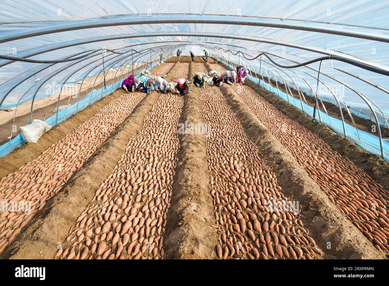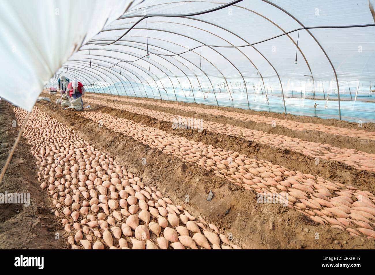 Luannan China March 14 2023: Farmers place sweet potato seeds in