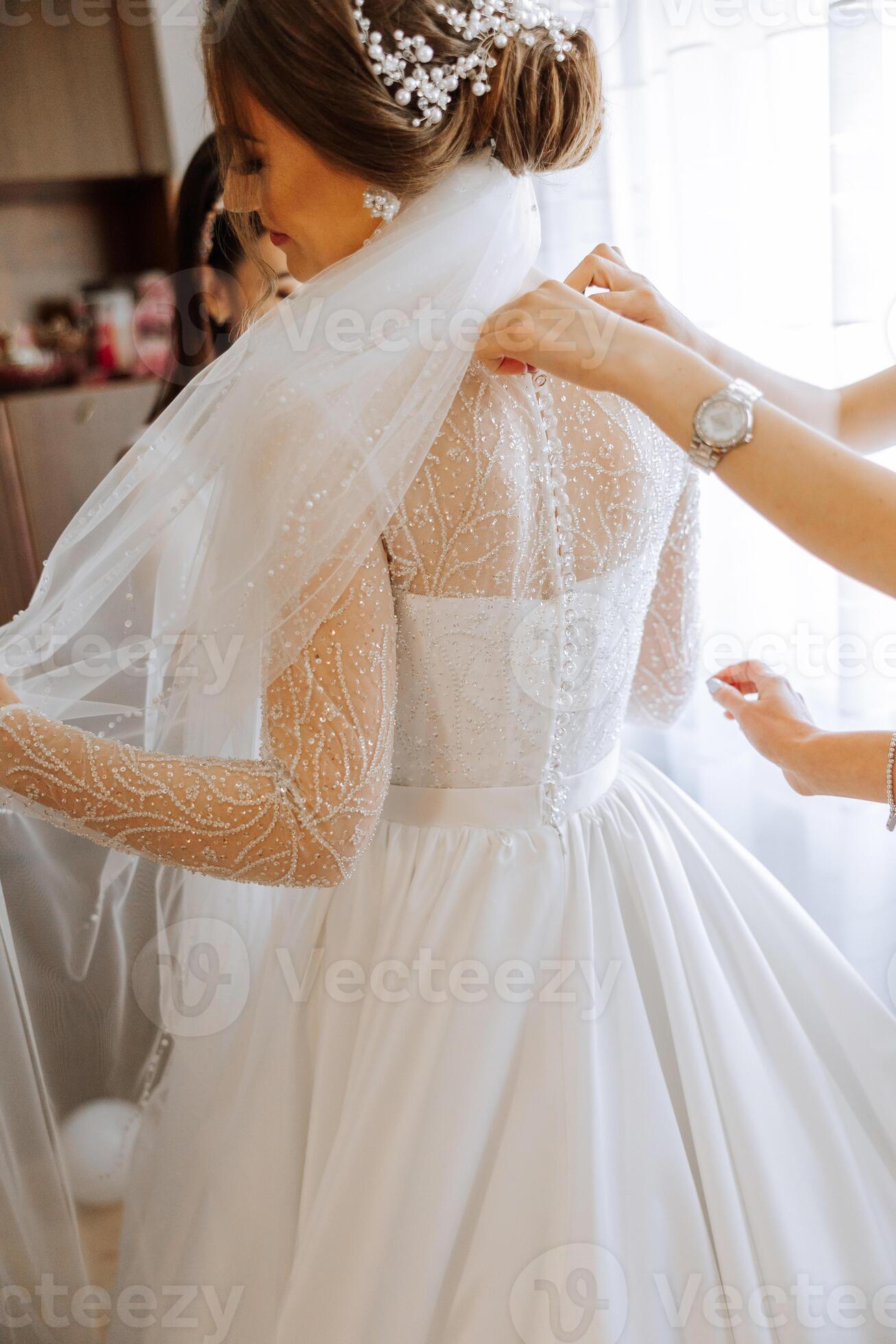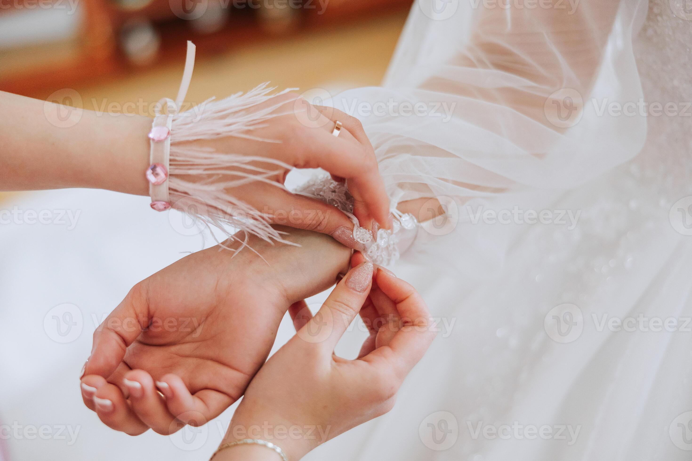 Female Hands of the Bride Fasten Buttons on the Sleeve on a Beautiful