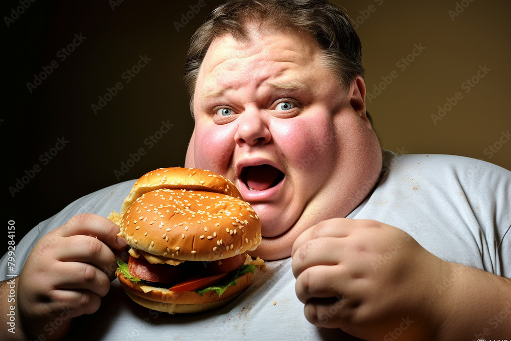 Fat Man Eating Fast Food Hamberger Breakfast for Overweight Person