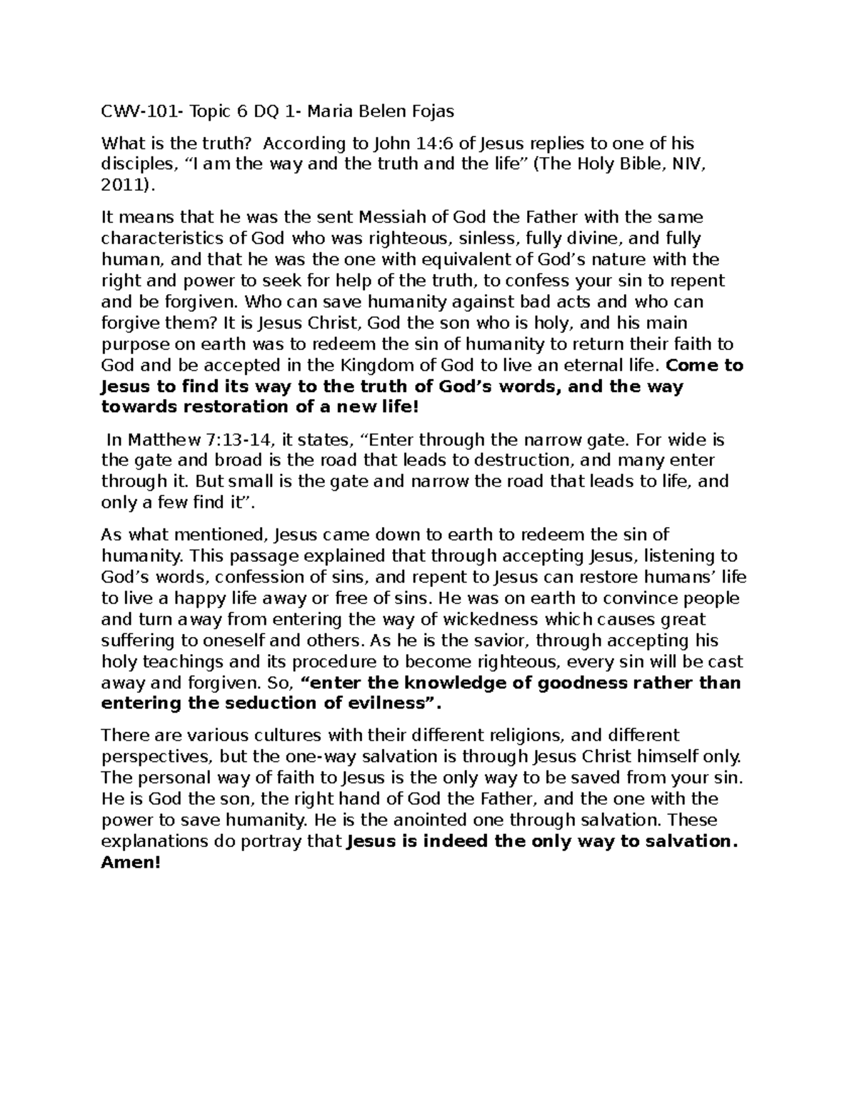 CWV 101 Topic 6 DQ 1 Maria Belen Fojas It means that he was the