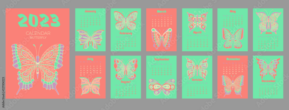 Vetor do Stock: Calendar 2023 with butterfly in zentangle style Week