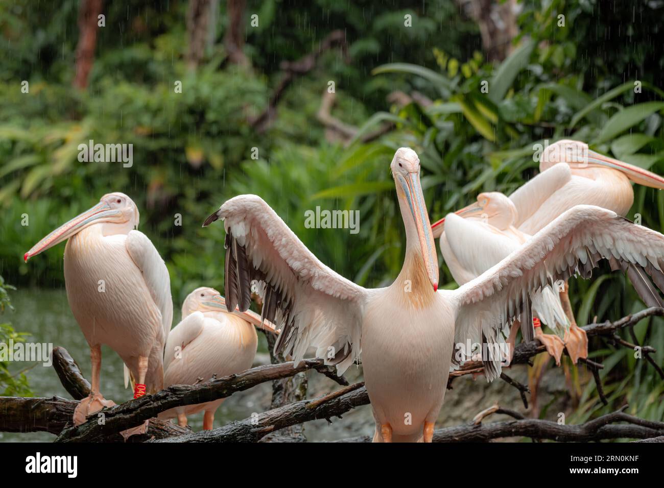 Three Beautiful White Pelicans with Large Beak and Long Neck Pelecanus
