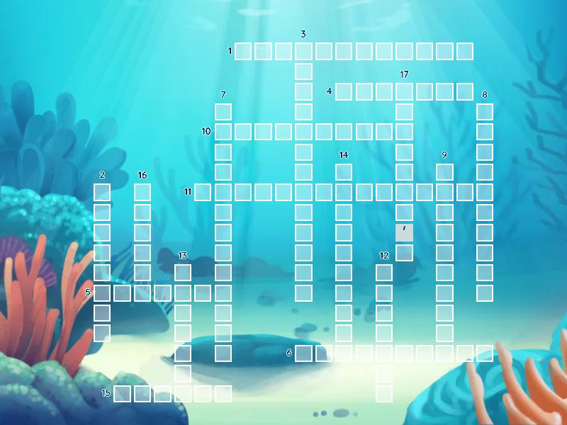 Crossword quiz game grid with cartoon fairytale underwater house