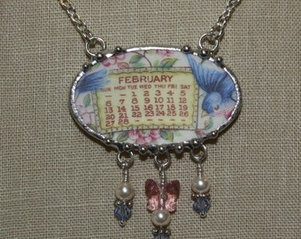 February 1921 Bluebird Calendar Plate Broken China Jewelry Necklace