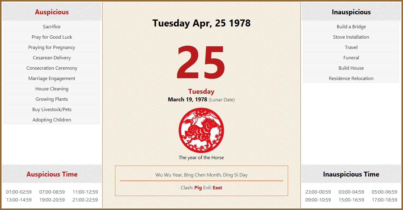 April 25 1978 Almanac Calendar: Auspicious/Inauspicious Events and