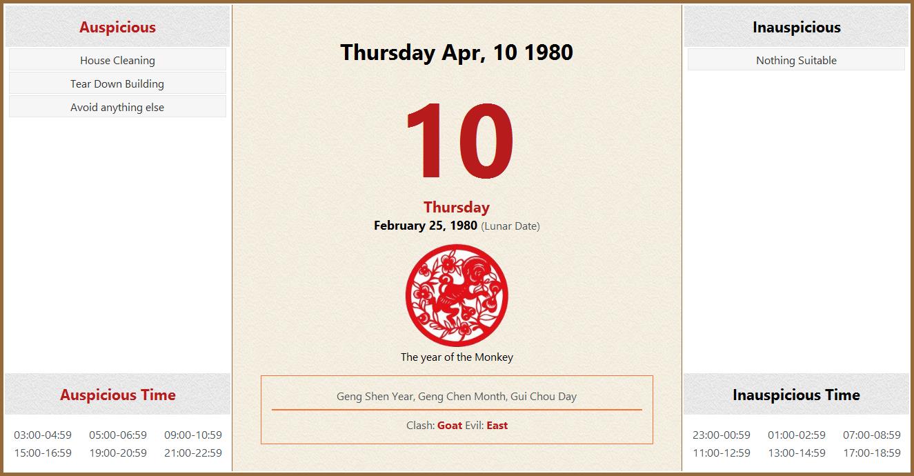 April 10 1980 Almanac Calendar: Auspicious/Inauspicious Events and
