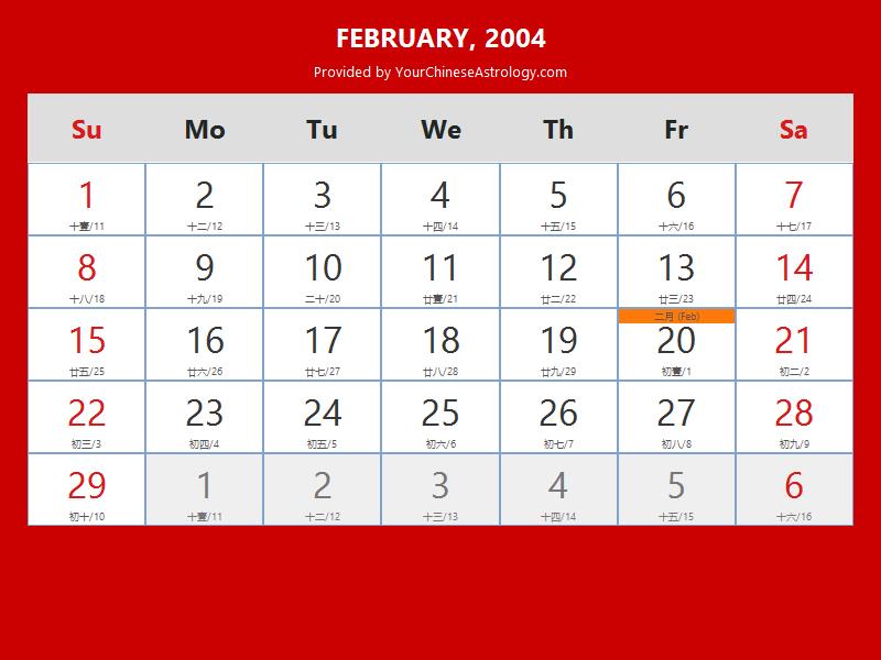 Chinese Calendar February 2004: Lunar Dates Auspicious Dates and Times